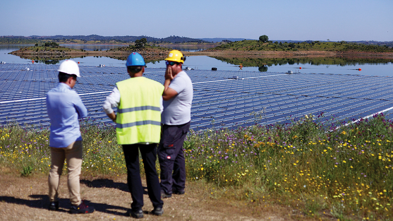 عمال يتحدثون أثناء تركيب مرايا (طاقة البرتغال)، أكبر مزرعة طاقة شمسية عائمة فوق سد في أوروبا، على سطح سد الكويفا في مدينة مورا البرتغالية.