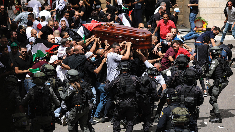 هاجمت الشرطة الإسرائيلية المشيعين الفلسطينيين الذين كانوا يحملون نعش الصحافية الفلسطينية المقتولة شيرين أبوعاقلة في 13 مايو الجاري، وقاموا بضرب حاملي النعش بالهراوات ورفسهم بالأرجل، حتى كاد النعش يسقط على الأرض. غير أن العديد من وسائل الإعلام الأميركية كان لديها انطباع مختلف عن ما حدث. وقال موقع تلفزيون «إم إس إن بي سي» في تقريره «اشتبكت الشرطة الإسرائيلية مع المشيعين في موكب الجنازة».