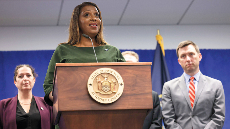 رفعت المدعية العامة لولاية نيويورك، ليتيشا جيمس، أول من أمس، دعوى مدنية ضدّ الرئيس الأميركي السابق دونالد ترامب وثلاثة من أولاده، في إطار التحقيق حول الممارسات الضريبية لمجموعته «منظمة ترامب».