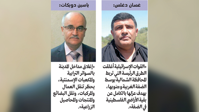 ويلفت إلى أن «القوات الإسرائيلية أغلقت الطرق الرئيسة التي تربط المحافظة الشمالية مع وسط الضفة الغربية وجنوبها، بهدف عزلها بالكامل عن بقية الأراضي الفلسطينية في الضفة»، مبيناً أن نابلس هي الأكثر تضرراً من هذا الحصار، من حيث عدد سكانها ومخيماتها وبلداتها وقراها.