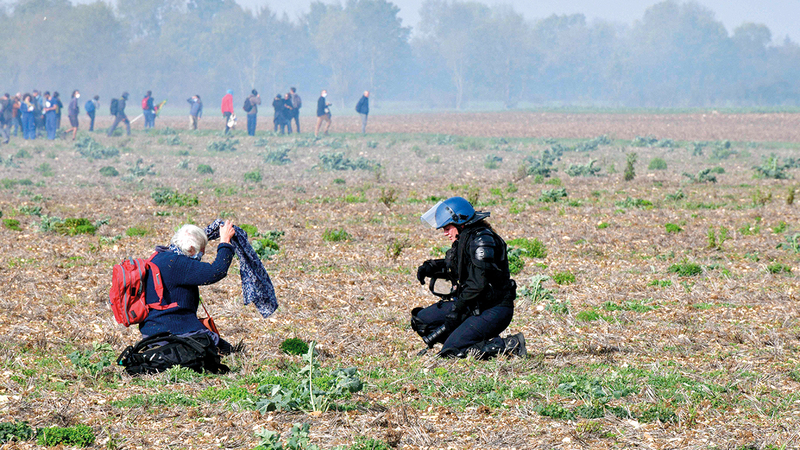 ناشط يواجه شرطي مكافحة الشغب خلال تظاهرة دعت إليها جماعة «باسين نون ميرسي» ضد الأحواض، بالقرب من موقع بناء احتياطي مائي جديد للري الزراعي غرب فرنسا.