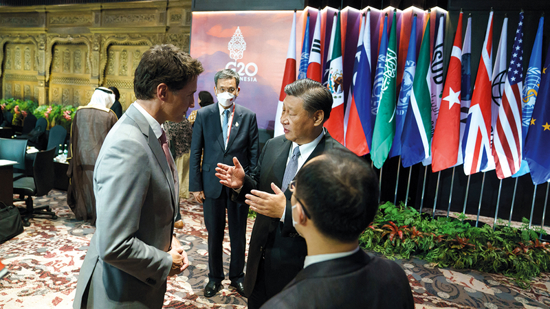 انتقد الرئيس الصيني شي جين بينغ رئيس الوزراء جاستن ترودو في قمة مجموعة العشرين يوم الأربعاء، لتسريبه تفاصيل اجتماع سابق كان ترودو قد أعرب من خلاله عن قلقه بشأن التدخل الصيني في الشؤون الداخلية. والتقى الزعيمان لفترة وجيزة في قمة العشرين التي انعقدت في إندونيسيا، وتمكنت وسائل الإعلام من تسجيل المواجهة التي حدثت بينهما. ورصدت كاميرا تلفزيونية كانت خلف مترجم صيني على مرأى من الجميع ما كان يتحدث به الزعيمان.