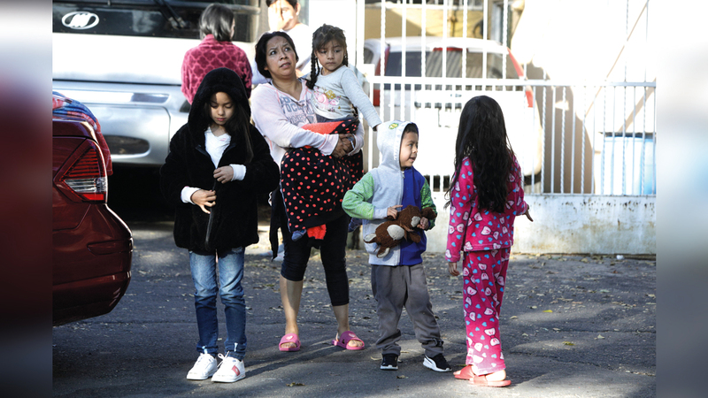 امرأة وأطفالها يخرجون إلى الشارع بعد شعورهم بهزة أرضية في العاصمة المكسيكية مدينة مكسيكو سيتي.