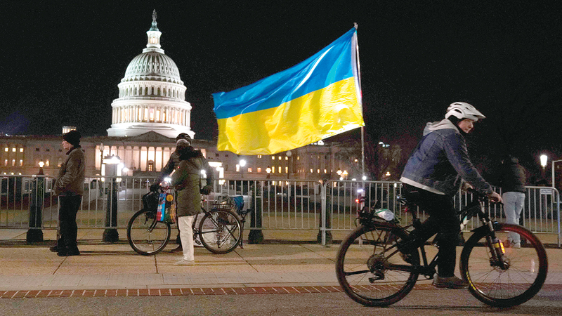 في الجهة الأخرى من جادة بنسلفانيا ما بعد مبنى بلدية واشنطن الذي أضيء بألوان العلم الأوكراني، تجمع المشرعون وكبار المسؤولين في إدارة بايدن لسماع خطاب زيلينسكي أمام أعضاء الكونغرس.