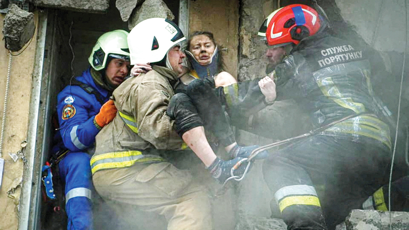 واصلت فرق الإنقاذ، أمس، البحث عن ناجين وسط أنقاض مبنى في دنيبرو بشرق أوكرانيا تعرّض لضربة صاروخية أدّت إلى مقتل نحو 23 شخصاً. وأظهرت صور بثتها وكالات الأنباء الصدمة والذهول على وجوه الأشخاص الذين تم إخراجهم أحياء من بين الأنقاض، فيما آخرون أخرجتهم فرق الإنقاذ جثثاً هامدة، وآخرون في عداد المفقودين لايزال المنقذون يبحثون عنهم سواء كانو أحياء أو أمواتاً، ويصل عددهم إلى قرابة 40 شخصاً، وكانت فرق الإنقاذ تسمع استغاثات المحاصرين أسفل الأنقاض حتى بعد ساعات من الانهيار الجزئي للمبنى، وطلب بعض المحاصرين المساعدة بواسطة أضواء هواتفهم المحمولة.