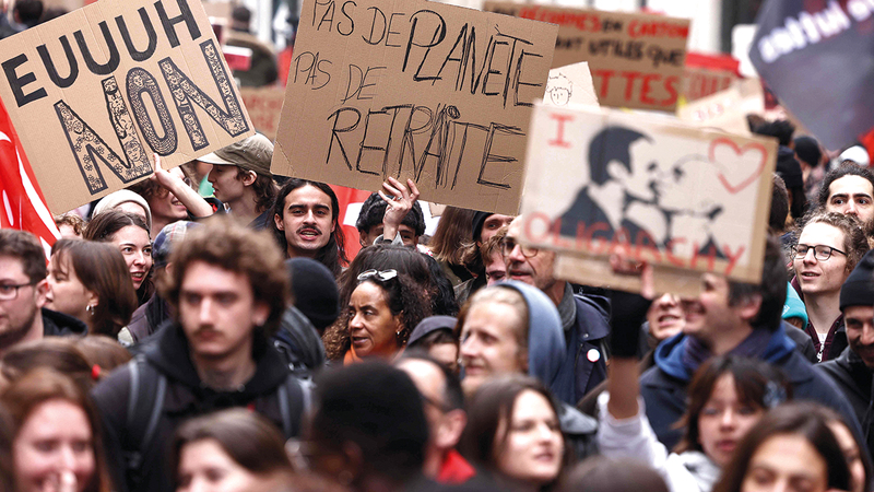 وتتعلق مشكلات ماكرون المحلية بخطته لرفع الحد الأدنى لسن التقاعد من 62 إلى 64. ويعيش الفرنسيون ما يقرب من عقد أطول مما كانت عليه الحال في عام 1980، ويقضون وقتاً أطول في تقاعدهم مقارنة بجيرانهم. وبدون إصلاح، يواجه نظام التقاعد عجزاً سنوياً قدره 14 مليار يورو، بحلول عام 2030. ولكن ماكرون فشل في إقناع الفرنسيين بأن إصلاحه هو الإجراء الصحيح. وفي العام الماضي، حرمه الناخبون من الحصول على أغلبية في البرلمان. والآن تريد النقابات أن تهزم مشروعه في الشوارع.