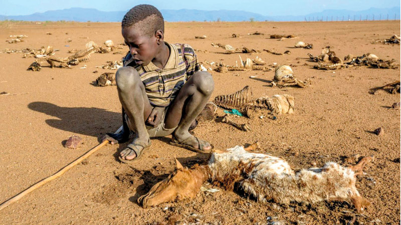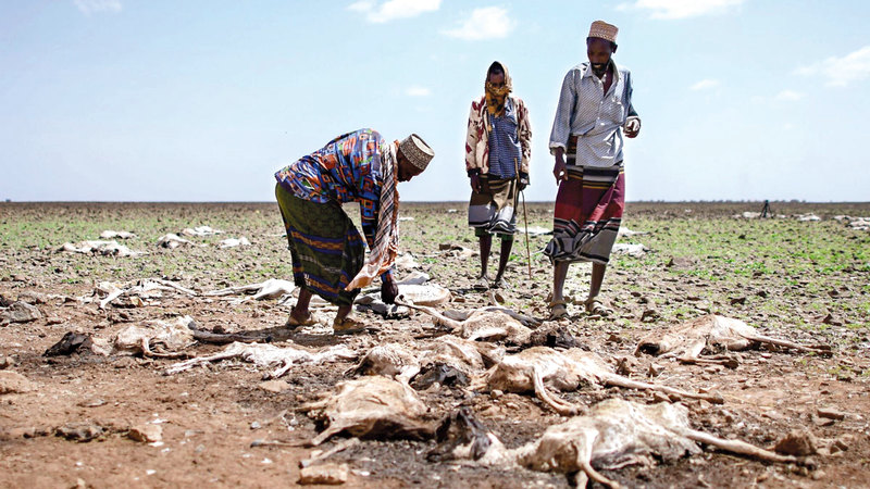 وتشهد المنطقة واحدة من أسوأ حالات الجفاف منذ 40 عاماً. وفي الآونة الأخيرة تراجعت كميات المطر خلال خمسة مواسم مطيرة إلى دون المتوسط بكثير. ووفقاً للأمم المتحدة، نفقت ما يقرب من 10 ملايين رأس ماشية بسبب الجفاف، ما يعني أنه لن يكون لدى أكثر من 36 مليون شخص ما يكفي من الطعام.