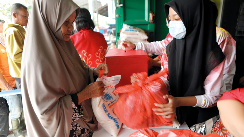 جمعيات خيرية إندونيسية توزع أكياساً من الطعام على الفقراء خلال رمضان.