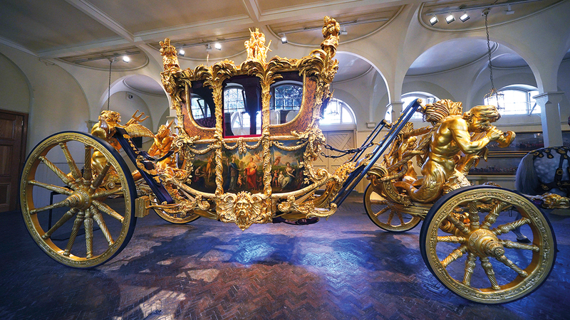 ويشتمل الجزء الداخلي للعربة على عينات من منقولات أخذت من المباني والقصور التاريخية، ويعلوها تاج مذهّب منحوت من خشب البلوط المأخوذ من السفينة فيكتوري، إحدى سفن القيادة في البحرية الملكية في القرن الـ18.