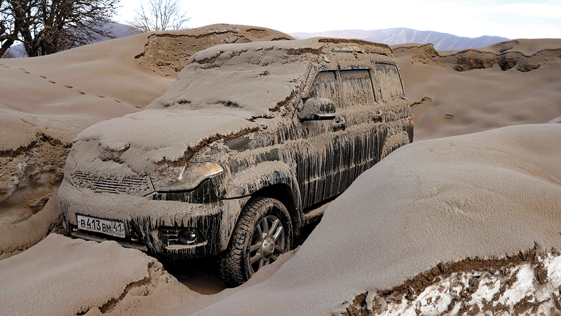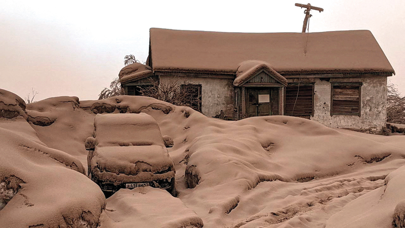 غطى رماد بركاني، أمس، الأرض والمنازل بعد ثوران بركان شيفلوتش في قرية كليوتشي في شبه جزيرة كامتشاتكا في روسيا. وينفث البركان رماداً هائلاً لليوم الثاني منذ الثلاثاء 11 أبريل 2023 على شبه جزيرة كامتشاتكا أقصى شرق روسيا، ما تسبب في غبار كثيف في السماء يغطي مساحات واسعة. وبدأ بركان شيفلوتش، وهو أحد أكثر البراكين نشاطاً في كامتشاتكا، في الثوران في وقت مبكر من يوم الثلاثاء، ما أدى إلى انتشار الغبار على مسافة 500 كيلومتر شمال غرب البلاد، وغمر قرى