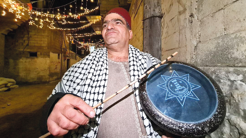 مع ساعات الفجر الأولى، التقت «الإمارات اليوم» المُسحر نزار الدباس، تزامناً مع مغادرته منزله في حي «قيزان النجار» في خان يونس، مرتدياً الزي السوري المرصع بخيوط التراث القديم، والكوفية الفلسطينية، وطربوشاً أحمر يلزم رأسه، ليتنقل على مدار ساعة كاملة داخل الحي الذي يقطنه.