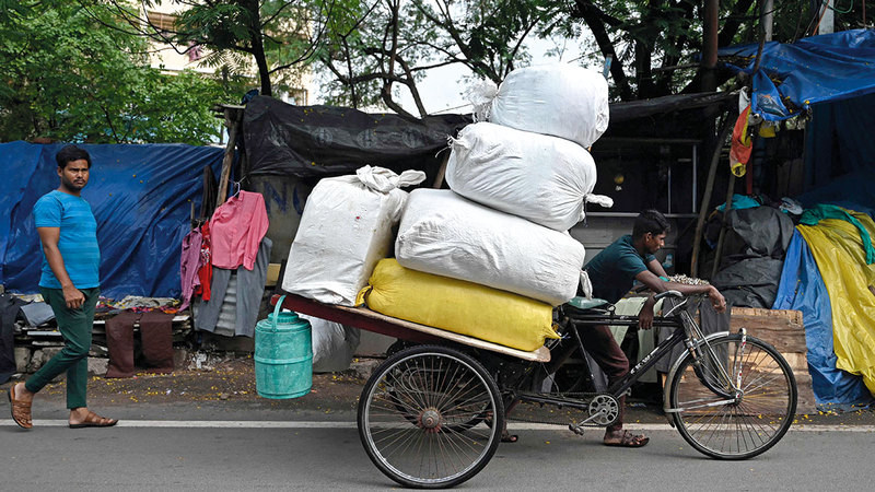 عامل يجرُّ عربة محملة بأكياس في طريقه إلى سوق الجملة بمدينة حيدر أباد في باكستان.