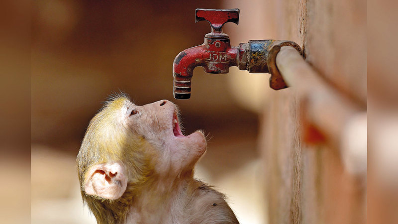 قرد يطفئ عطشه من إحدى حنفيات الشارع بمنطقة برياغراج في الهند. أ.ف.ب