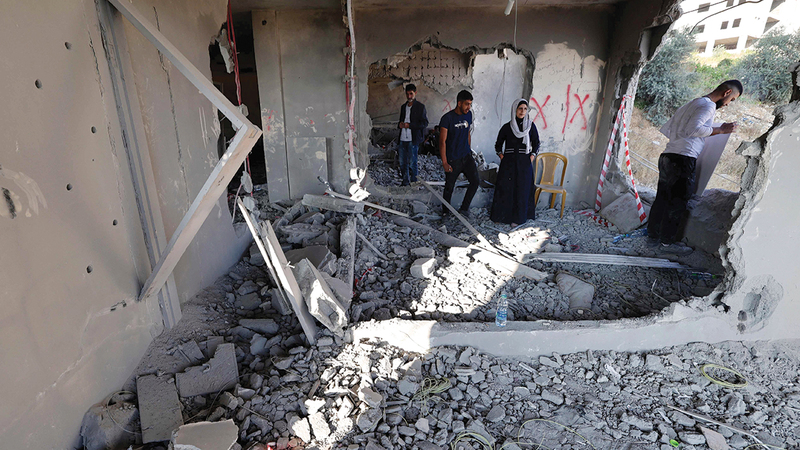 فلسطينيون يتفقدون منزل كمال جوري في نابلس بعد أن هدمته القوات الإسرائيلية. أ.ف.ب