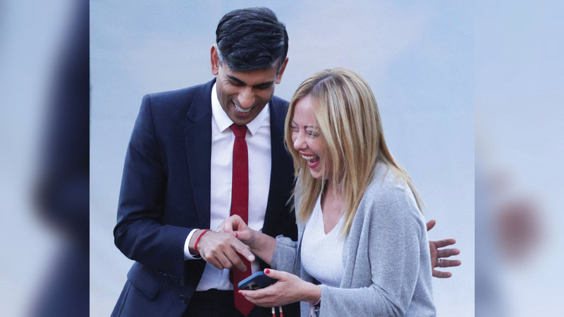 سوناك وميلوني في نوبة ضحــك بعد أن أظهرت له صورة على هاتفها