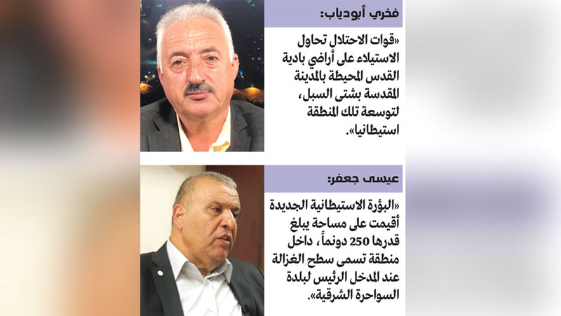 ويقول أبودياب لـ«الإمارات اليوم»، إن «قوات الاحتلال تحاول الاستيلاء على أراضي بادية القدس المحيطة بالمدينة المقدسة بشتى السبل، لتوسعة تلك المنطقة استيطانياً، وربطها بمستوطنة (معاليه أدوميم) كبرى المستوطنات الجاثمة على أراضي المقدسيين، وكذلك بشبكة المواصلات الإسرائيلية».
