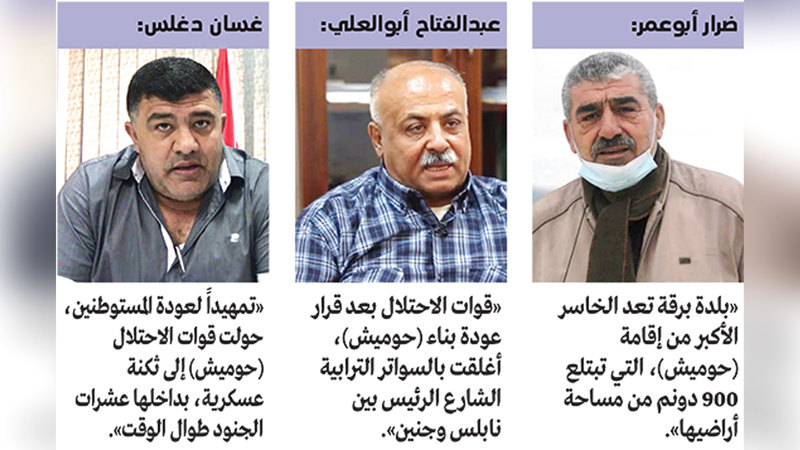 ويحذر مسؤول ملف الاستيطان من تحويل «حوميش» إلى معسكر لجيش الاحتلال، إذ ستصبح حياة 34 ألف فلسطيني معرضة للخطر، في كل وقت وحين.