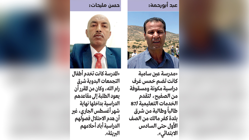 ويضيف: «كانت المدرسة آخر ما تبقى داخل تجمع عين سامية، وبالتالي لن يعود الطلبة ثانية إلى التجمع البدوي الذي هجرته عائلاتهم قبل ثلاثة أشهر، وهو ما يهدف إليه الاحتلال الذي خطط لتفريغ المنطقة من كامل سكانها، وإزالة كل ما يربطهم بأرضهم في عين سامية».