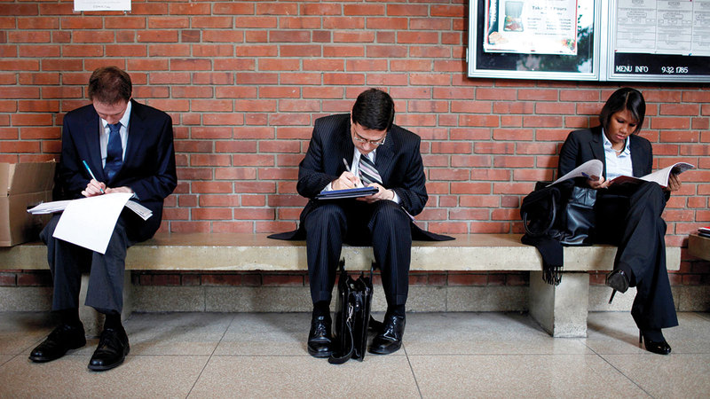 باحثون عن عمل داخل أحد معارض التوظيف في الولايات المتحدة. رويترز - أرشيفية