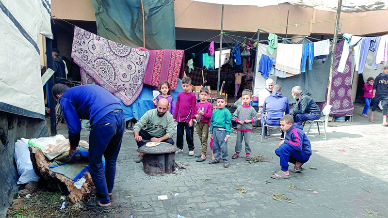 بالانتقال إلى مدينة دير البلح وسط قطاع غزة، يقول أبومحمد الغول (54 عاماً) في حديثه مع «الإمارات اليوم» بغضب شديد، إن «منزلي مكون من طابق واحد فوق مساحة قدرها 100 متر مربع يحتضن حالياً 50 فرداً من أقاربي المدمرة منازلهم، من بينهم أفراد عائلتي، لافتاً إلى أنه كان يشترى في السابق ربطة خبز تضم 50 رغيفاً كانت توفرها المخابز قبل إغلاقها، وكانت تكفي لتوفير رغيف لكل فرد من الأسرة، لكنني لم أتمكن طوال الأيام الماضية من توفير رغيف خبز لكل فرد من العائلة ونتقاسم جميعاً الخبز».
