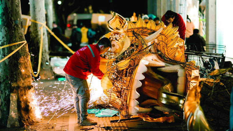 عامل يقوم بتجميع تمثال لتنين في الشارع لتزيين نافذة متجره استعداداً لاحتفالات العام الصيني الجديد المقبلة في شنغهاي. وستوافق السنة القمرية الصينية الجديدة، والتي تسمى أيضاً «عيد الربيع» 10 فبراير 2024، والتي تسمى بعام التنين.