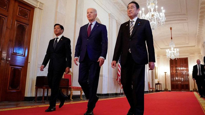 بايدن خلال اجتماعه الثلاثي مع رئيس الوزراء الياباني فوميو كيشيدا والرئيس الفلبيني. رويترز