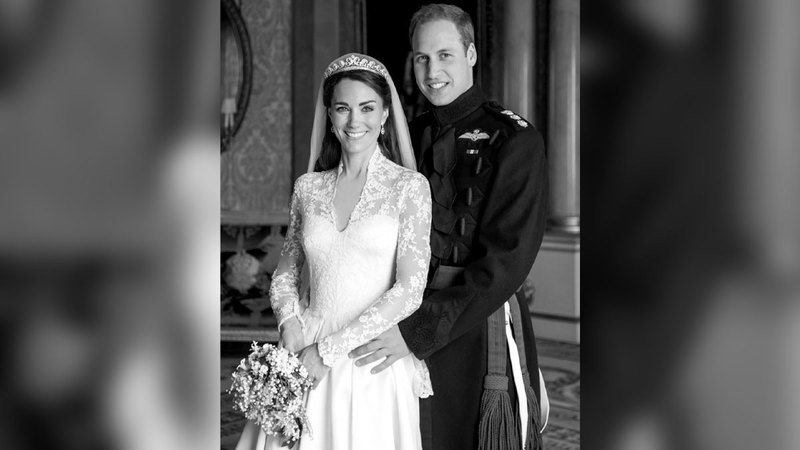 وتبدو كيت في الصورة، التي التقطت في قصر باكنغهام، وهي ترتدي ثوب زفافها المذهل وتاجها وتمسك بباقة زفافها، ويقف وليام بجانبها ويضع يديه على عروسه الجديدة.