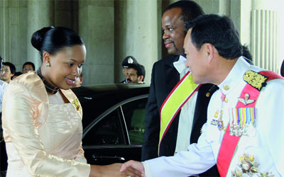 ملك سوازيلاند مع إحدى زوجاته وهي تصافح ملك تايلاند. أ.ف.ب