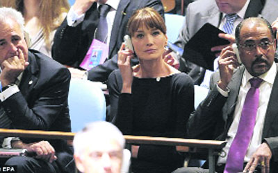 على الرغم من أنها تتقن أربع لغات بطلاقة، إلا أن كارلا بروني زوجة الرئيس الفرنسي نيكولا ساركوزي تحتاج إلى المساعدة لفهم ما يقوله زوجها، فقد استخدمت سماعات الترجمة كي تستمع إلى خطاب الرئيس ساركوزي الذي تركز حول الوضع المالي العالمي في الامم المتحدة يوم الثلاثاء الماضي. وكانت بروني، وهي عارضة أزياء سابقة مولودة في ايطاليا، ترتدي ثوباً اسود، تجلس في الصفوف الاولى خلال قمة أهداف الالفية لمحاربة الفقر في الامم المتحدة في نيويورك. وقد حضر القمة، التي تستمر مدة ثلاثة أيام، أكثر من 140 رئيس دولة أو حكومة. وبدت بروني جادة تماماً ومركزة اثناء إنصاتها للمبادرة المثيرة للجدل التي أطلقها زوجها.