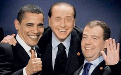 كثيراً ما كان رئيس الوزراء الايطالي سلفيو بيرلسكوني، حريصاً على السخرية من الرئيس الاميركي باراك اوباما، لاسيما خلال اول قمة «عشرين» جمعت بينهما عام ،2009 وكان بيرلسكوني قد وصف الرئيس الجديد بأنه وسيم وشاب و«مظلل» بالسواد، كالسيارة، وفي الصورة يظهر اوباما مبتسماً لهذه السخرية، رافعاً اصبعه علامة التأكيد، آملاً ان ينتهي اثر تلك المزحة قريبا. أما الرئيس الروسي ديمتري مدفيدف، فيبدو كما لو انه لم يلاحظ سخرية بيرلسكوني، ولوح بيده بدلاً عن ذلك لوالدته التي ربما كانت تراقبه في تلك اللحظة.