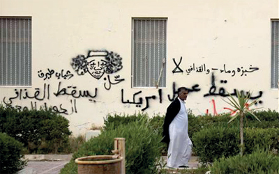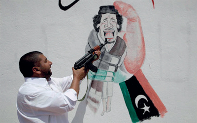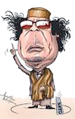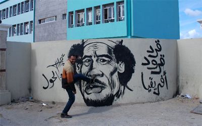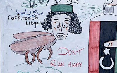 تقول هدى أبوزيد، التي اغتال عملاء القذافي في لندن والدها المنشق، والتي تعمل الآن مع الثوار، تقول «في الحقيقة يعمل الشعب الليبي على مسح صورة القذافي الرسمية، لكنهم يضعونها بدلاً عن ذلك داخل إطار كاريكاتوري كنوع من الانتقام منه».