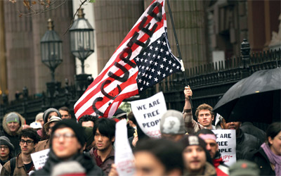 يقول رجل الاعمال ستيف كوريلو البالغ من العمر 57 عاما، والذي كان جالسا على كرسي متحرك في احد احتجاجات «احتلوا واشنطن»، إنني «أمتلك شركة كمبيوتر خاصة بي، وسافرت حول العالم ولاأزال أؤمن بالولايات المتحدة». ويضيف «لكنني سئمت العيش هنا، إذ لم اعد اطيق التلفزيون الأميركي ولا حتى جلسات مقاهي ستاربكس، فهناك دول اقل خطورة يزدهر فيها الدولار، أود الذهاب الى السلفادور».