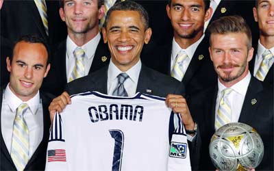 داعب الرئيس الأميركي باراك أوباما، كابتن المنتخب الإنجليزي لكرة القدم سابقاً ونجم فريق نادي غالاكسي لوس أنجلوس لكرة القدم دافيد بيكهام، ووصفه بـ«الشاب القادم»، وقال «قلت لبيكهام إن نصف أعضاء الفريق هم مثل أبنائك، لقد تقدمنا في العمر يا دافيد».