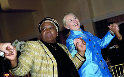 وقامت بالرقص على أنغام الموسيقى الافريقية. وبينما كانت الوزيرة كلينتون تصفق معبرة عن سعادتها، اقتربت منها المغينة الافريقية جوديث سيفوما، ودعتها إلى مركز الصالة، وبدأت ترقص أمامها لتظهر لها مدى براعتها في حركات الرقص الافريقي، بينما بدأ الضيوف الآخرون بالرقص حول سيفوما وكلينتون اللتين كانتا ترقصان معاً، الامر الذي أثار سعادة الجمهور الموجود.