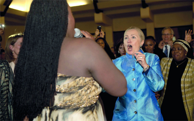 على الرغم من شهرة وزيرة الخارجية الأميركية، هيلاري كلينتون، كسياسية جادة، إلا أنها تعرف في بعض الأحيان كيف تستمتع بوقتها جيداً. فعندما تمت دعوتها الى حفل استقبال أقامته وزيرة خارجية جنوب إفريقيا، مات نكونا ماشبان، على شرفها، قررت كلينتون أن تنسى هموم السياسة وتعيش تلك اللحظة كما يجب.