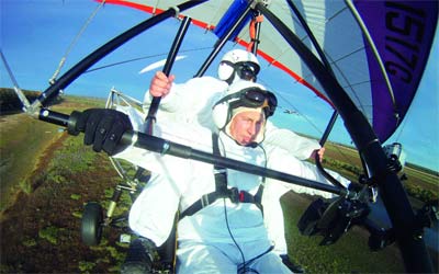 وارتدى الزعيم الروسي حلة تشبه حلة الطيارين ذات لون أبيض وخوذة، من أجل الرحلة الجوية فوق منطقة مستنقعات نائية تقع خارج مدينة ساليخارد على بعد نحو 1930 كيلومتراً شمالالعاصمة موسكو.