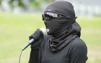 ملثمة من فتيات جماعة «بلاك بلوك» لحماية المتظاهرات. أرشيفية