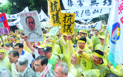 تظاهر مئات النشطاء والصيادين التايوانيين أمام السفارة الفلبينية في تايبيه، ورموا المكتب الاقتصادي والثقافي الفلبيني بالبيض، خلال احتجاج ضد الحكومة الفلبينية، بعد أن تم إطلاق النار على صياد من سفينة فلبينية، في المياه المتنازع عليها في بحر الصين الجنوبي الأسبوع الماضي. ووجهت تايون إنذارا للفلبين، كي تقدم اعتذارا رسميا لعائلة صياد الأسماك، الذي قتل في إطلاق النار من قبل خفر السواحل الفلبينيين في المياه قبالة شمال الفلبين «وإلا فإنها ستدفع الثمن». وتدور خلافات دبلوماسية بين الفلبين وتايوان والصين وسلطنة بروناي وماليزيا وفيتنام، بشأن مناطق في بحر الصين الجنوبي، يحتمل أن تكون غنية بالنفط والغاز وحيث تتلاقى ممرات ملاحية مهمة. وتتصاعد هذه الخلافات أحيانا إلى مواجهة بين السفن. وقال مسؤول مصايد فلبيني إن إحدى السفن الفلبينية، التي كانت تعمل تحت تهديد بأن تتعرض لصدام أطلقت النار الخميس الماضي على سفينة صيد أسماك تايوانية، على بعد نحو 170 ميلا بحريا جنوب شرق تايوان، ما أدى إلى مقتل شخص على ظهرها. وقال نائب المتحدث باسم الرئاسة الفلبينية أبيجيل فالت، إن رئيس السفارة الفلبينية بتايوان، اعتذر وقدم تعازيه إلى عائلة. وسئل عما إذا كان هذا الاعتذار اعترافا بأن السلطات الفلبينية ارتكبت خطأ، فقال فالت، إن هذا يعتبر بشكل أكبر «إعرابا عن الأسف العميق لهذا الحادث المؤسف»، مشددا على أن التحقيقات جارية، وأنه سيكون من الأفضل انتظار نتائج التحقيق. لكن تايوان لم تقتنع بالموقف الفلبيني. وقال بيان لمكتب الرئاسة في تايوان «إذا استمر مكتب الرئاسة الفلبينية، في الرد على طلبنا بمثل هذا الموقف، فسيتعين عليهم دفع الثمن». وذكرت وسائل إعلام محلية تايوانية، إن تايوان ستجمد كل طلبات الفلبينيين الجديدة للعمل في الجزيرة، ويوجد حاليا نحو 80 ألف فلبيني، يعملون في تايوان.