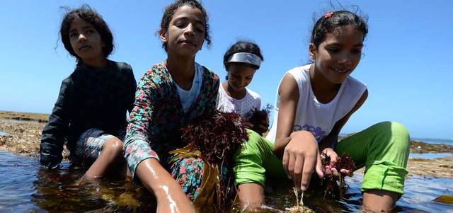 فتيات يجمعن طحالب البحر على شاطئ الجديدة، على بعد 100 كيلومتر من الدار البيضاء في المغرب. وتراجع حصاد هذه الأعشاب البحرية الغنية بالمعادن، بشكل كبير، على ساحل المحيط الأطلسي في المغرب، بسبب زيادة عدد الصيادين، واستنفاد كميات الأعشاب البحرية.