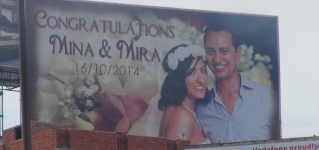 فوجئ المصريون منذ نهاية الشهر الماضي بلوحات إعلانية بالحجم الكبير، تغمر كل جسور القاهرة تحمل لقطة حالمة لعروسين شابين ومكتوب بجانبها بالإنجليزية «أجمل التهاني ـــ ميرنا ومينا»، وتطوّر الأمر فأصبح التقاط صور بجانب اللوحة جزءاً من طقوس الأفراح لعديد من الفتيات والشبان.