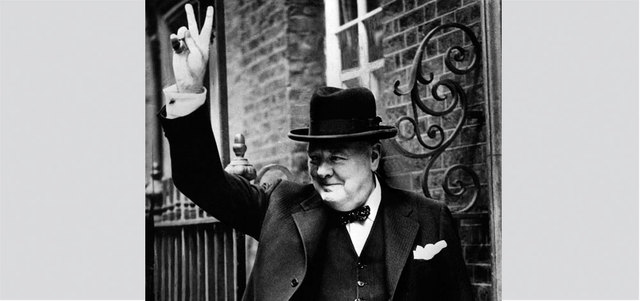 تشيرتشل الذي اشتهر برفعه معنويات البريطانيين في مواجهة الغارات الجوية والصاروخية الألمانية. أ.ف.ب