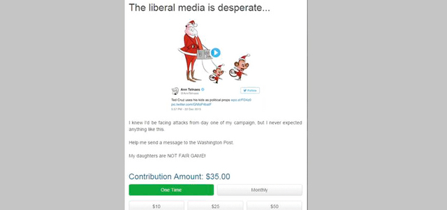 وكتب تحت الرسم الذي يظهر فيه المرشح الجمهوري بلباس بابا نويل «تيد كروز يستخدم ابنتيه أداة سياسية».