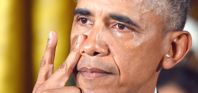 بكى أوباما في الخامس من يناير 2016 خلال إعلانه إجراءات تنفيذية للحد من حمل السلاح، وفي 13 مايو 2014 لاحظ بعضهم الدموع، وهي تنحدر من عينيه، عندما كان يستعرض الهجوم على القنصلية الأميركية في بنغازي بليبيا، الذي حدث في 11 سبتمبر 2012.