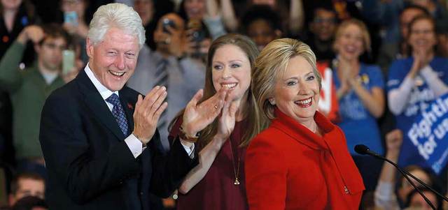 هيلاري تتحدث إلى أنصارها وإلى جوارها زوجها بيل وفي الوسط ابنتهما تشيلسي. د.ب.أ