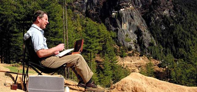 صورة لأمير ويلز ترجع إلى عام 1998 وهو يرسم بالألوان المائية قرب معبد بوذي خلال زيارته بوتان في هيمالايا. أ.ف.ب