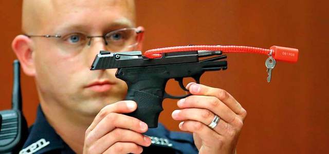 صورة أرشيفية لضابط شرطة سانفورد بولاية فلوريدا يعرض المسدس أداة الجريمة الذي عرض في المزاد أمس. أ.ب