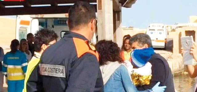 ونقل خفر السواحل الإيطالي الرضيعة إلى جزيرة لامبيدوسا، أول من أمس.
