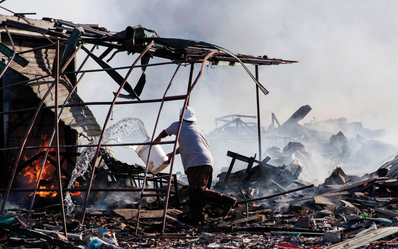 كما شوهد في السوق التي دمّرت بالكامل محققون يتفحصون الأدلة في محاولة لتحديد سبب الكارثة.