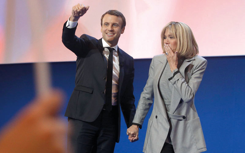 بريجيت وماكرون يداً بيد خلال الحملة الانتخابية. أ.ب