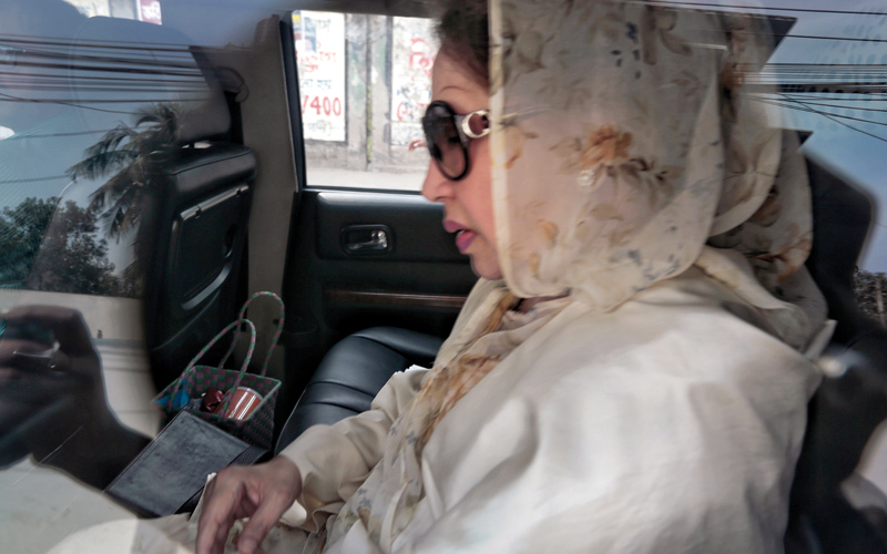 خالدة ضياء لدى وصولها إلى المحكمة في دكا أمس. أ.ب
